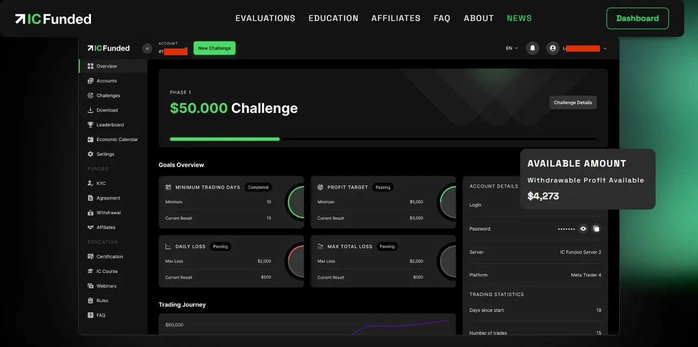 With a funded account, you (the funded trader) gain access to larger trading capital (up to $500,000 with IC Funded) that allows you to maximize your results.