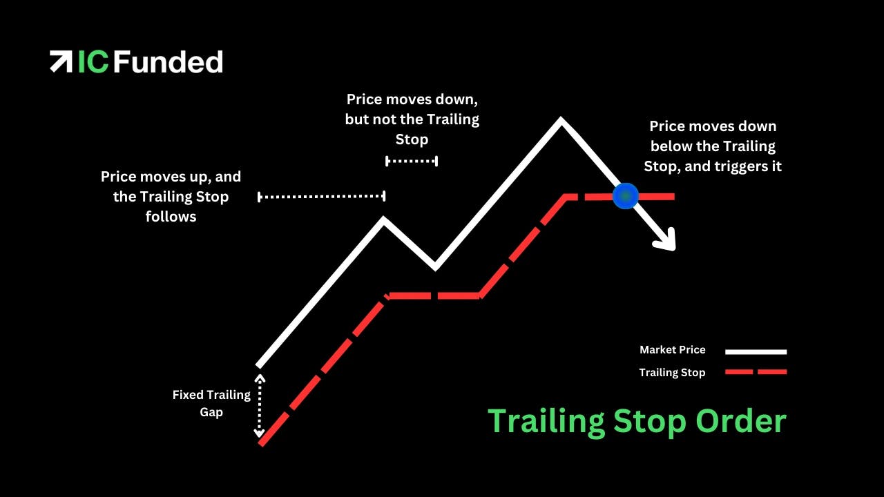 A trailing stop order is a type of stop-loss that follows your position. If the price of the asset or underlying asset rises, it secures your position. However, if the asset or stock price falls, it remains in place and closes your position.